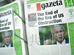 中新網(wǎng)12月13日電 據(jù)日本共同社報(bào)道,隨著《氣候變動(dòng)框架公約》締約國第14次會(huì)議在波茲南閉幕,波蘭著名報(bào)紙《選舉報(bào)》(英文版)12日刊行一份“假號外”,諷刺美國布什政府始終拒絕批準(zhǔn)《京都議定書》。