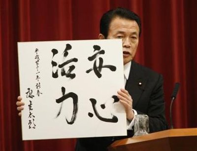 麻生當(dāng)首相后,因為幾次在電視現(xiàn)場直播的國會發(fā)言中念了錯別字,因此有了“錯別字大王”的雅稱。而日前親筆手寫的四個字中,又有一個字寫錯,他留給國民的那一種“沒文化”的印象顯得更深。