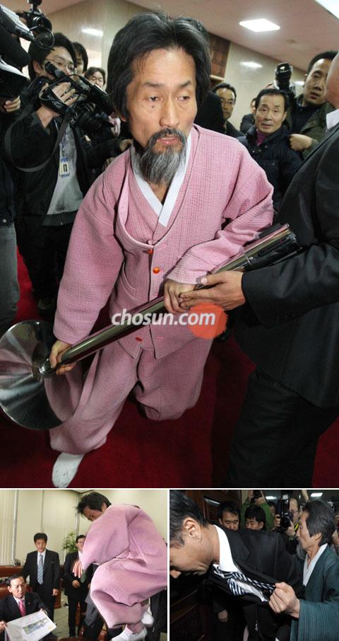 中新網(wǎng)1月6日電 據(jù)韓國《朝鮮日報》報道,5日上午,韓國首爾汝矣島的國會大廈變成了一片混亂之地。身穿韓服的民主勞動黨代表姜基甲一直不停地踢國會議長辦公室門口。姜基甲大聲大叫:“國會議長在哪里?趕快出來!”姜基甲手里拿著長圓型鐵棒試圖進入議長辦公室,但被國會警衛(wèi)人員阻止。之前,姜基甲進入國會秘書長辦公室,在國會秘書長樸啟東眼前,用拳頭敲打圓形桌子,要顛翻桌子。他甚至蹦到桌子上,氣得直跺腳。