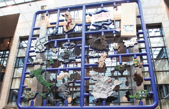 施爾尼(David Cerny)的這個(gè)創(chuàng)作,上周末高掛在比利時(shí)布魯塞爾歐盟總部入口。眼尖的人馬上發(fā)現(xiàn)有點(diǎn)不對(duì),保加利亞竟以一堆看似蹲式馬桶的圖像構(gòu)成,法國(guó)就是個(gè)空洞的法國(guó)地圖,上面貼著“罷工中”。德國(guó)的代表圖像,竟是幾道公路構(gòu)成類(lèi)似納粹的符號(hào),波蘭牧師撐起同性戀彩虹旗。英國(guó)呢?根本沒(méi)有英國(guó),因?yàn)橛?guó)一向?qū)W盟抱有敵意,不肯加入歐元區(qū)。