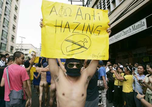 菲律賓首都馬尼拉的街頭2日傳出尖叫的歡呼聲,不是什么大明星出現(xiàn),而是當(dāng)?shù)匾凰髮W(xué)兄弟會(huì)的成員,以裸奔的方式抗議高漲的學(xué)費(fèi),這種犧牲色相的抗議方式馬上引來眾人圍觀,差點(diǎn)引發(fā)當(dāng)?shù)仳}亂。