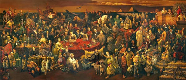 這幅油畫長(zhǎng)6米、高2.6米,繪有103位世界名人,中國(guó)的萬里長(zhǎng)城、埃及的金字塔、英國(guó)的巨石陣等地標(biāo)作為背景出現(xiàn)在油畫中。