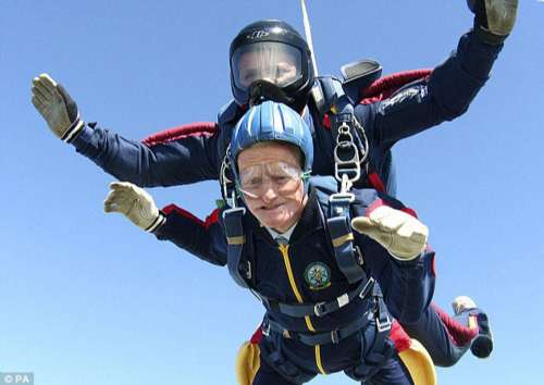英國《每日電訊報(bào)》網(wǎng)站報(bào)道,這位勇于冒險(xiǎn)的老人名為喬治-莫伊斯,來自多塞特郡。為慶祝自己將于本月八日到來的九十八歲生日,他在跳傘顧問的協(xié)助下乘飛機(jī)從威爾特郡一機(jī)場上空跳下,并平安返回地面。