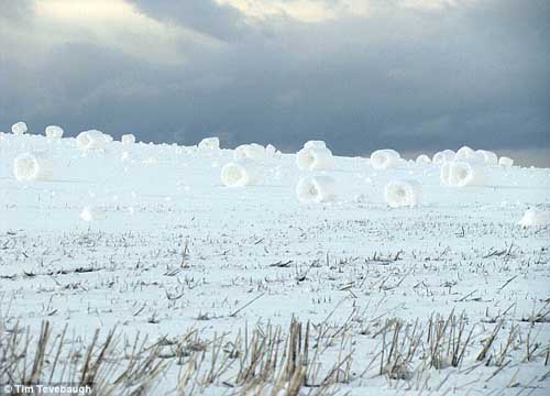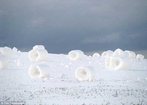 這幅景象是在美國愛達(dá)荷州的大草原上被Tim Tevebaugh偶然發(fā)現(xiàn)的,他稱:“在我早晨開車上班的路上,我從沒有見到過它們(雪卷),所以它們一定是幾小時(shí)內(nèi)在這片地方產(chǎn)生的。”
