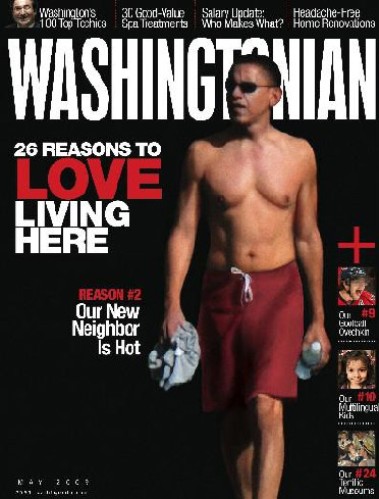《華盛頓人》雜志政治記者Garrett Graff說,讀者一看到5月號的封面之后,各種評論和意見就蜂擁而至。這張封面照片是奧巴馬僅穿著一條游泳褲,帶著墨鏡,上身赤裸。旁邊標(biāo)題寫著:“我們的新鄰居很火辣”(Our new neighbor is hot)。