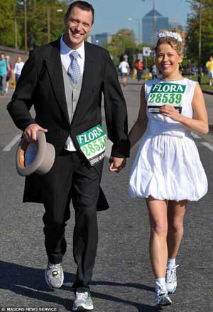 他們倆在比賽開始后七小時(shí)零五分鐘才跑到終點(diǎn)。新娘把花束擲向群眾時(shí),新郎甚至有氣力支撐著她走過終點(diǎn)。皮特說:“這是我一生中最美好的一天,但我決定不再做這種事了。”