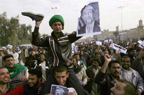 納杰夫地區(qū)的一名示威者用鞋子拍打美國(guó)總統(tǒng)布什的畫(huà)像。