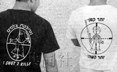 中新網(wǎng)3月24日電 據(jù)日本共同社報(bào)道,以色列《國土報(bào)》日前稱,以軍士兵中最近流行穿一種原創(chuàng)T恤,T恤上印著漠視巴勒斯坦人生命的圖案和文字,例如將瞄準(zhǔn)器對(duì)準(zhǔn)阿拉伯孕婦,并配上“一槍殺兩人”的文字。