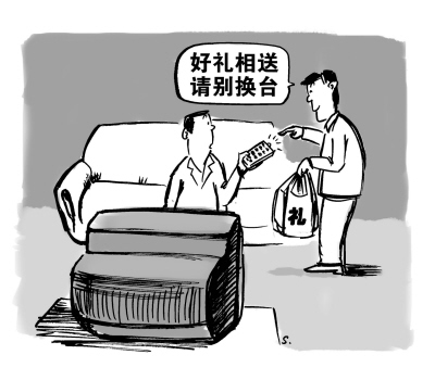 我選了“收買”條件最好的一家衛(wèi)視臺節(jié)目,每天一開電視,就鎖定這家頻道,堅持了起碼大半年。本來,家里最喜歡看本地電視臺,可人家電視臺禮金高,收了人家的錢,拿了人家的禮,我也要負責(zé)任的。再說了,現(xiàn)在電視臺節(jié)目也差不多,一個電視劇幾家同時播,看哪臺不都差不多?而且,人家的節(jié)目也不錯。