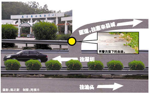 昨日記者來(lái)到事發(fā)現(xiàn)場(chǎng),幾位揭陽(yáng)市公安局交警支隊(duì)惠來(lái)高速公路大隊(duì)的民警正在現(xiàn)場(chǎng)做警戒。警戒線(xiàn)圍起的事發(fā)地點(diǎn),就位于深汕高速進(jìn)入服務(wù)區(qū)路口不遠(yuǎn)處。這個(gè)路口可以通往惠來(lái)縣城,也可通往惠來(lái)高速公路大隊(duì)。