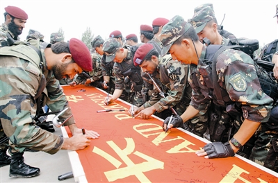今天(9日)9時(shí)20分,“友誼—2010”中巴反恐聯(lián)合訓(xùn)練上演“壓軸戲”,200余名中巴特種兵在蘭州軍區(qū)某訓(xùn)練基地舉行實(shí)兵實(shí)彈綜合演練。隨后,此次中巴反恐聯(lián)合訓(xùn)練落下帷幕。
