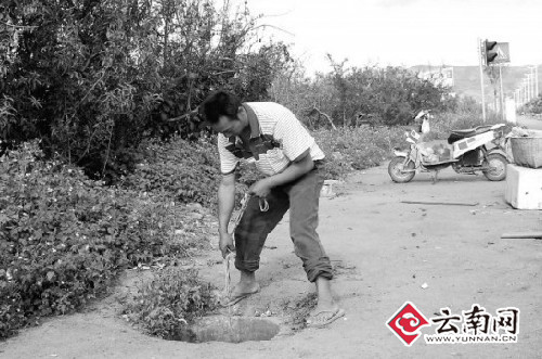 昨日下午,蒙自縣文瀾鎮(zhèn)高家寨的戴橋紅,正拎著一只水桶在紅河大道上找水,他找水的地方是紅河大道上的排污管道。在紅河大道的非機(jī)動車道上,許多窨井蓋都不見了,紅河大道兩旁的果農(nóng)們,每天都會開著車或者騎著摩托來找水。