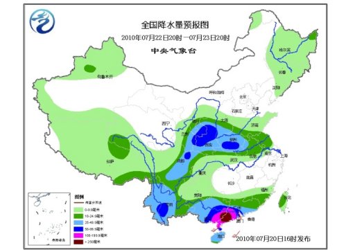 21日20時至22日20時,新疆西部、青海南部和東部、西藏中部、甘肅東部、寧夏、陜西大部、山西南部和西北部、內(nèi)蒙古東北部、東北大部、黃淮大部、江淮、江漢、江南西部和南部、華南大部、西南地區(qū)大部等地有小到中雨或陣雨,其中,甘肅東部、陜西南部、四川北部、河南中南部、湖北北部、安徽中北部、江蘇西北部、云南東部、廣西東南部、廣東大部、海南等地有大雨或暴雨;廣東沿海、海南北部等地有大暴雨,局部特大暴雨;上述局部地區(qū)并伴有短時雷雨大風等強對流天氣。新疆中部、內(nèi)蒙古西部、東北東部等地有4~6級風。受熱帶風暴“燦都”的影響,南海北部海域?qū)⒂?~9級大風,“燦都”中心經(jīng)過的附近海面的風力可達10~11級,部分海域陣風可達12級。