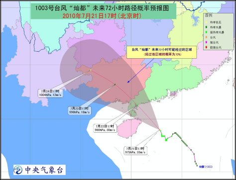 預計,“燦都”將以每小時10-15公里的速度向西北方向移動,逐漸向海南文昌到廣東陽江一帶沿海靠近,并有可能于22日早晨到下午在這一帶沿海登陸。