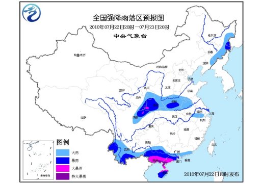 中新網(wǎng)7月22日電 據(jù)中央氣象臺網(wǎng)站消息,中央氣象臺7月22日18時繼續(xù)發(fā)布暴雨黃色預(yù)警:預(yù)計,7月22日20時到7月23日20時,廣東沿海和西南部、廣西大部、海南、云南西部和南部、四川盆地西部、甘肅東部、陜西中南部、湖北西北部、河南大部、安徽北部和東南部、浙江西北部以及黑龍江東南部、吉林東部、遼寧東北部等地有大雨或暴雨,其中,廣東西南部、廣西南部、海南北部的部分地區(qū)有大暴雨或特大暴雨;四川盆地西北部、陜西西南部的局部地區(qū)有大暴雨;上述地區(qū)局地并伴有短時雷雨大風(fēng)等強(qiáng)對流天氣。