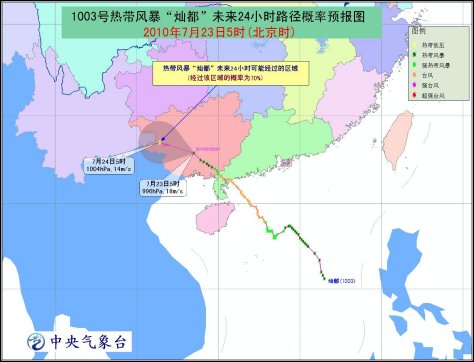 臺風(fēng)“燦都”于22日19時在廣東省西部廉江境內(nèi)減弱為強熱帶風(fēng)暴,20時其中心進(jìn)入廣西博白境內(nèi),隨后減弱為熱帶風(fēng)暴。23日5時熱帶風(fēng)暴“燦都”的中心位于廣西南寧市境內(nèi),就是北緯22.9度,東經(jīng)108.5度,最大風(fēng)力有8級(18米/秒),中心最低氣壓為996百帕。