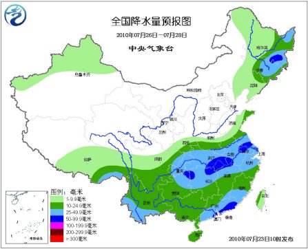 23-25日,西北地區(qū)東部、黃淮、江淮、江漢、四川盆地、云南西部和南部等地有40-80毫米降雨,其中陜西南部、河南、四川東北部等地的部分地區(qū)降雨量有100-160毫米;東北地區(qū)、新疆西部有15-35毫米陣性降雨。