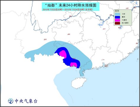 受“燦都”減弱后的低壓和西南季風(fēng)的共同影響,23日晚上到24日白天,北部灣、廣西沿海仍將有6-7級(jí)大風(fēng),陣風(fēng)可達(dá)8-9級(jí);廣東西南部、廣西中南部和西部、云南南部和西部、貴州西南部等地有大雨或暴雨,其中,廣西西南部和南部的部分地區(qū)有大暴雨,局地有特大暴雨。