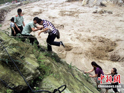 由于連續(xù)的降雨讓綿茂公路漢旺至清平段多處出現(xiàn)的不同程度的塌方,道路中斷。當(dāng)消防官兵行至距離天池高橋段6公里處,山體滑坡留下的滾石和湍急的山洪將去路切斷,消防車和救援船艇無法前行,情況緊急,中隊(duì)長(zhǎng)田海南迅速命令全體人員攜帶救援裝備涉水前進(jìn)。消防官兵立即將救援橡皮艇放入水中,哪知兇猛的洪流將橡皮艇沖得無法穩(wěn)槳,被水中的亂石劃破,無法使用救援工具,行進(jìn)又萬分艱難,消防官兵只得摸著山體,踏著過膝的洪水摸索前進(jìn)。1個(gè)多小時(shí)后,終于到達(dá)了時(shí)發(fā)地點(diǎn)。此時(shí),河床寬度達(dá)20余米,洪流湍急。