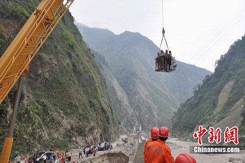 事發(fā)后,綿竹市政府立即調(diào)派大型機(jī)械疏導(dǎo)交通。10時(shí)許,隨著水位下降,綿竹市防洪辦率礦山救援隊(duì)和大型吊車、裝載機(jī)進(jìn)入天池鄉(xiāng)。德陽市消防支隊(duì)副支隊(duì)長(zhǎng)李先平也率增援力量到達(dá)現(xiàn)場(chǎng),F(xiàn)場(chǎng)成立救援指揮部,并根據(jù)現(xiàn)場(chǎng)情況部署改進(jìn)救援方案。由于水位下降后,河床寬度明顯減小,指揮部決定利用吊車長(zhǎng)臂懸掛鋼筋鐵框伸過河床救人,一次可以裝上6、7個(gè)人,大大減少了救援時(shí)間。15時(shí)許,經(jīng)過全體救援人員的不懈努力,50余名被困人員被成功解救,無一人受傷。