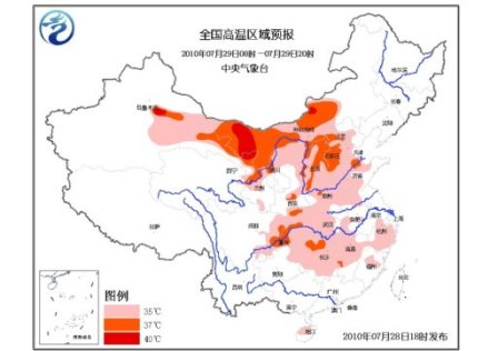 預(yù)計(jì),明天白天,京津地區(qū)、河北大部、山西、陜西關(guān)中地區(qū)和東部、寧夏中北部、河南大部、山東中西部、安徽北部、湖北、四川盆地東部、重慶、貴州東北部、湖南大部、江西中北部、浙江大部、福建北部、海南北部等地有35℃以上的高溫天氣,局地最高氣溫可達(dá)37~38℃;內(nèi)蒙古中西部、甘肅大部、新疆吐魯番盆地及南疆盆地東部等地將有35~37℃的高溫天氣,局地最高氣溫可達(dá)40℃以上。