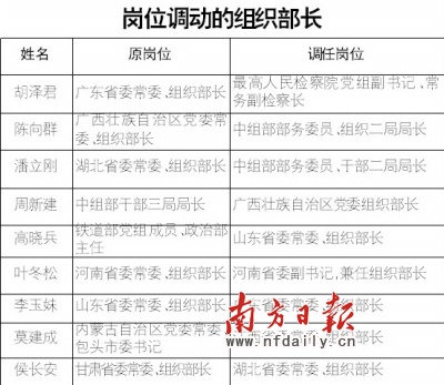 令人十分關注的是,已有三位省級組織部長調(diào)任中央。其中,原廣東省委組織部長胡澤君任最高人民檢察院黨組副書記、常務副檢察長;原廣西自治區(qū)組織部長陳向群任中組部部務委員、組織二局局長;原湖北省委組織部長潘立剛?cè)沃薪M部部務委員、干部二局局長。據(jù)公開的資料顯示,此三人在擔任地方組織部長前,均有在中央部委的工作經(jīng)歷。