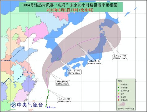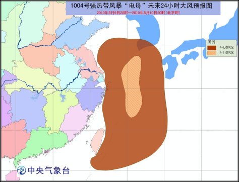 中新網(wǎng)8月9日電 據(jù)中央氣象臺預(yù)報稱,中央氣象臺8月9日18時發(fā)布臺風黃色預(yù)警:今年第4號熱帶風暴 “電母”(DIANMU,名字來源:中國,名字意義:神話中的雷電之神)于8日晚在臺灣以東洋面上生成,9日下午加強為強熱帶風暴。9日17時其中心位于浙江省舟山市東南方大約390公里的東海海面上,就是北緯28.0度,東經(jīng)125.5度,中心附近最大風力有11級(30米/秒),中心最低氣壓為980百帕。
