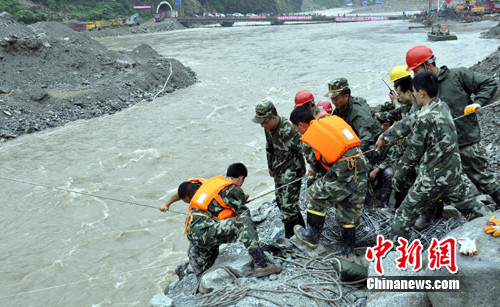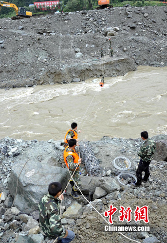中新網(wǎng)映秀8月18日電(郭永全 張浪 鄢銀嬋)18日早6點(diǎn),汶川消防大隊(duì)映秀消防站接到武警水電部隊(duì)求助電話,在位于映秀鎮(zhèn)堰塞湖處處理淤泥沙石拓寬河道的數(shù)十名機(jī)械工人因河道加寬,水流湍急,無(wú)法從原來(lái)搭設(shè)的繩橋往返對(duì)岸進(jìn)行作業(yè)。