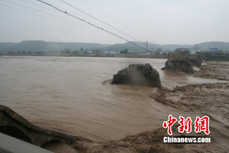 截止19日上午8時(shí),安縣茶坪鄉(xiāng)降雨量達(dá)到149.3毫米、高川鄉(xiāng)降雨量達(dá)到117.3毫米、沸水鎮(zhèn)降雨量達(dá)到150.4毫米、秀水鎮(zhèn)降雨量達(dá)到134.4毫米、桑棗鎮(zhèn)雨量達(dá)到123.6毫米。強(qiáng)降雨導(dǎo)致安昌河、雎水河、秀水河流域河水猛漲,上午9:43分,縣城上游1公里處,花荄先林大橋被特大洪水沖垮。這是自8月2日凌晨黃土大橋垮塌后,在短短的20天內(nèi),安縣第二座被洪水沖垮的跨度在200米以上的大橋。