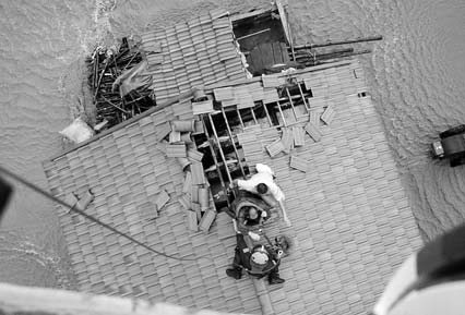 經(jīng)過近兩個(gè)小時(shí)的飛行,B~7312救助直升機(jī)到達(dá)丹東機(jī)場中轉(zhuǎn)加油。此時(shí)傳來的消息是:洪水已經(jīng)漲至齊腰深,4名群眾被困“孤島”。由于當(dāng)?shù)靥鞖馔蝗蛔儔,潘偉?duì)長、副駕駛李春雨數(shù)次嘗試?yán)@開雷雨區(qū),均未成功。直升機(jī)隨即返航。