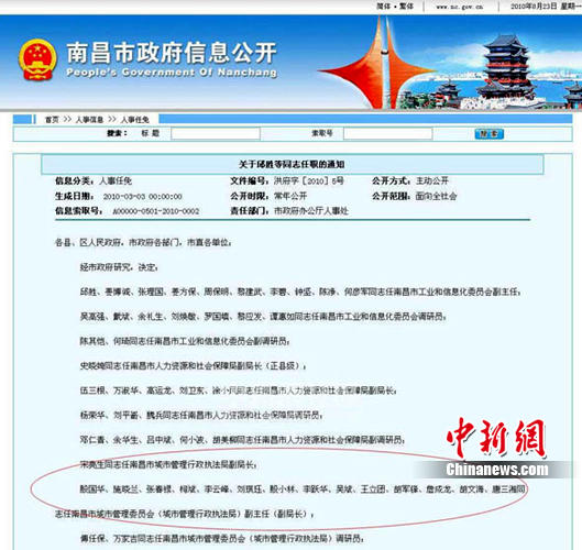 8月23日,中新網(wǎng)記者在南昌市政府信息公開網(wǎng)找到南昌市政府發(fā)布的洪府字[2010]5號文件,該文件名為“關(guān)于邱勝等同志任職的通知”(以下簡稱為“通知”)。通知顯示,南昌市政府任命了一批南昌市工業(yè)和信息化委員會、市人力資源和社會保障局、市城市管理委員會(城市管理行政執(zhí)法局)以及市文化新聞出版局的官員。