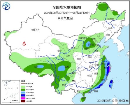 30日20時(shí)至31日20時(shí),新疆南疆西部、西藏大部、青海東部和南部、西北地區(qū)中東部、內(nèi)蒙古中西部和東北部、黑龍江大部、遼寧西部、華北大部、黃淮東部、江淮東部、江南東部、華南東部和南部、四川大部、重慶西部、貴州西北部、云南大部等地有小到中雨或陣雨,其中,川西高原中部、山西東北部、江蘇東南部、上海、浙江中東部、福建東部沿海、廣東東部沿海、臺(tái)灣等地有大雨或暴雨;浙江東部的局部地區(qū)有大暴雨;上述部分地區(qū)并伴有短時(shí)雷雨大風(fēng)等強(qiáng)對(duì)流天氣。新疆南疆盆地南部的部分地區(qū)有揚(yáng)沙或浮塵天氣,新疆南部、內(nèi)蒙古東部、東北北部等地有4~5級(jí)風(fēng)。受“獅子山”和第8號(hào)熱帶風(fēng)暴的共同影響,東海南部海域、南海北部海域、臺(tái)灣海峽、臺(tái)灣以東洋面的風(fēng)力將有6~8級(jí),陣風(fēng)可達(dá)9~10級(jí),其中南海北部部分海域的風(fēng)力將有9~11級(jí),陣風(fēng)可達(dá)11~12級(jí)。