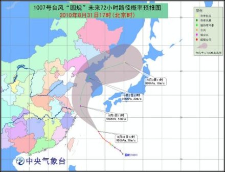 今年第7號臺風“圓規(guī)”的中心31日17時位于浙江象山東南方大約690公里的西北太平洋洋面上,就是北緯26.8度、東經(jīng)128.2度,中心附近最大風力有13級(38米/秒),中心最低氣壓為965百帕。