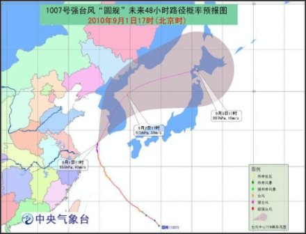 今年第7號臺風“圓規(guī)”于9月1日13時在東海北部海面上加強為強臺風,17時其中心位于韓國濟州西偏南方大約170公里的海面上,就是北緯33.2度、東經(jīng)124.7度,中心附近最大風力有14級(45米/秒),中心最低氣壓為955百帕。