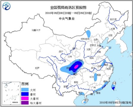 中新網(wǎng)9月8 日電 據(jù)中央氣象臺網(wǎng)站消息,中央氣象臺9月8日18時發(fā)布暴雨藍(lán)色預(yù)警:9月8日20時到9日20時,四川盆地、川西高原中部、甘肅東南部、陜西南部、重慶西部和北部、福建東南部沿海、廣東中東部沿海、臺灣中南部等地有大雨或暴雨,其中,四川盆地東北部局地有大暴雨。另外,內(nèi)蒙古中部、山東半島東部、蘇皖中部、江西西部、廣西東南部、海南南部等地的部分地區(qū)有大雨。上述局部地區(qū)并伴有短時雷雨大風(fēng)或冰雹等強(qiáng)對流天氣。