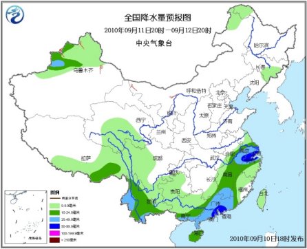 10日20時(shí)至11日20時(shí),新疆西北部、青海南部、西藏中東部、內(nèi)蒙古東南部、東北中南部、山東東部、江淮中東部、江南大部、華南、四川西部、重慶東南部、貴州、云南等地有小到中雨或陣雨,其中,江蘇東部和南部、上海、安徽東南部、浙江大部、江西東北部和東南部、福建西北部和南部、廣東大部、廣西南部、海南中北部、云南大部、川西高原南部、西藏東南部等地有大雨或暴雨,局地有大暴雨;上述地區(qū)局部并伴有短時(shí)雷雨大風(fēng)或冰雹等強(qiáng)對(duì)流天氣。新疆北部、內(nèi)蒙古東部、東北南部、華北東北部等地有4~5級(jí)風(fēng)。黃海南部海域有5~6級(jí)西南風(fēng)增大到7~8級(jí)的旋轉(zhuǎn)風(fēng),陣風(fēng)可達(dá)9~10級(jí);東海西部海域、臺(tái)灣海峽有7~8級(jí)偏南風(fēng),陣風(fēng)可達(dá)9~10級(jí);南海東北部海域、臺(tái)灣以東洋面和以南海域有5~7級(jí)西南風(fēng);黃海中部海域?qū)⒂?~6級(jí)東北風(fēng)。