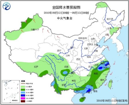 11日08時(shí)至12日08時(shí),新疆西北部、青海南部、西藏中東部、吉林南部、遼寧中北部、江淮大部、江南中東部和南部、華南以及西南地區(qū)大部有小到中雨或陣雨,其中,江蘇東南部、上海、浙江大部、江西東北部和東南部、福建大部、廣東中南部和東部、廣西南部、云南南部等地有大雨或暴雨;上述地區(qū)局部并伴有短時(shí)雷雨大風(fēng)或冰雹等強(qiáng)對(duì)流天氣。新疆北部、甘肅西部等地有4~6級(jí)風(fēng)。黃海南部海域、東海西部和北部海域?qū)⒂?~8級(jí)、陣風(fēng)9~10級(jí)大風(fēng)。