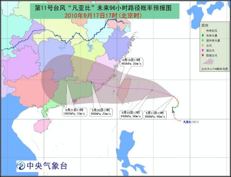 預(yù)計(jì),“凡亞比”中心將以每小時(shí)10-15公里的速度先向西偏北方向移動(dòng),以后逐漸轉(zhuǎn)向偏西方向移動(dòng),移速將略有加快,強(qiáng)度繼續(xù)加強(qiáng),并向我國臺(tái)灣東部一帶沿海靠近,將于19日凌晨到白天在臺(tái)灣東部沿海登陸;之后,“凡亞比”將穿越臺(tái)灣島進(jìn)入臺(tái)灣海峽,向福建中部到廣東東部一帶沿海靠近。