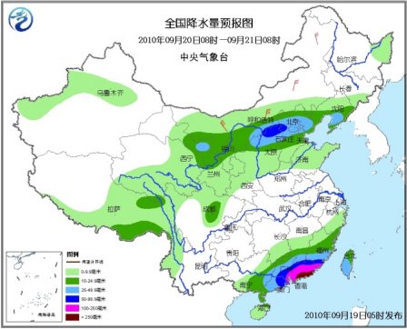 20日08時至21日08時,新疆沿天山地區(qū)、西藏南部和東部、西北地區(qū)中東部、內(nèi)蒙古西部和中東部偏南地區(qū)、東北地區(qū)南部和東北部、華北、黃淮東北部、四川中北部、云南西部、江南南部、華南大部有小到中雨或陣雨,其中,甘肅河西地區(qū)東部、內(nèi)蒙古河套東部、陜西北部、山西北部、北京、天津北部、河北中北部、遼寧中南部等地的部分地區(qū)有大雨、局地暴雨;福建南部、臺灣中南部、廣東、江西南部、廣西東部等地有大到暴雨;福建東南部、廣東中東部等地的部分地區(qū)有大暴雨、局部特大暴雨;上述地區(qū)局部并伴有短時雷雨大風或冰雹等強對流天氣。新疆北部、甘肅西部、寧夏、內(nèi)蒙古大部、華北北部和東部有4~6級風,新疆山口地區(qū)風力可達7~9級。受“凡亞比”影響,東海南部有6~8級東南風;臺灣海峽、南海北部有7~9級大風,部分海域風力可達10~11級,臺風中心經(jīng)過的附近海域有12~13級大風;臺灣以南海域有6~7級、陣風8級的偏南風。渤海有4~5級增加到6~7級的東北風。