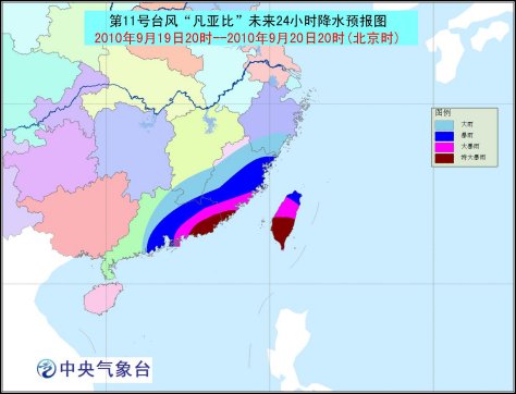 受其影響,未來24小時,東海南部、臺灣以東洋面、臺灣海峽、巴士海峽、巴林塘海峽、南海東北部、浙江南部沿海、臺灣及其沿海、福建沿海、廣東中東部沿海將有7-9級大風(fēng),其中福建中南部沿海、廣東東部沿海、臺灣海峽的部分海面或地區(qū)風(fēng)力可達(dá)10-11級,“凡亞比”中心經(jīng)過的附近海面或地區(qū)的風(fēng)力有12-13級;福建大部、浙江南部、江西東南部、廣東中東部、臺灣等地將有大到暴雨,其中福建東南部、廣東東部、臺灣等地的部分地區(qū)有大暴雨,局地有特大暴雨。中央氣象臺已于今日18時發(fā)布了暴雨藍(lán)色預(yù)警。