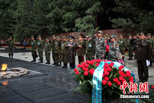中新網(wǎng)哈薩克斯坦阿拉木圖9月20日電 (記者 孫自法)“和平使命-2010”聯(lián)合反恐軍事演習(xí)中、俄等參演部隊代表一行,19日專程前往阿拉木圖市潘菲洛夫勇士紀(jì)念公園,獻(xiàn)花憑吊“二戰(zhàn)”時參加莫斯科保衛(wèi)戰(zhàn)的反法西斯英烈。