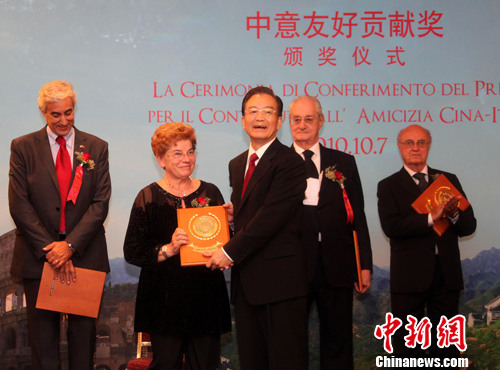 中新社羅馬10月7日電 (記者 周兆軍)中國總理溫家寶7日在羅馬向10位意大利友好人士頒發(fā)“中意友好貢獻(xiàn)獎”,以表彰他們?yōu)榇龠M(jìn)中意關(guān)系發(fā)展所做的努力。