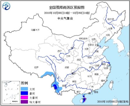 中新網(wǎng)10月8日電 中央氣象臺10月8日10時繼續(xù)發(fā)布暴雨藍(lán)色預(yù)警:10月8日14時到9日14時,海南中東部、雷州半島、云南西部、西藏東南部等地有大雨或暴雨,其中海南東部的部分地區(qū)有大暴雨;上述地區(qū)局部伴有短時雷雨大風(fēng)等強(qiáng)對流天氣。