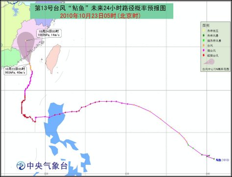 該預(yù)警指出,今年第13號(hào)強(qiáng)臺(tái)風(fēng)“鲇魚”已于10月22日21時(shí)在南海東北部海面減弱為臺(tái)風(fēng),23日5時(shí)其中心位于福建省廈門市偏南方約150公里的臺(tái)灣海峽南部海面上,就是北緯23.1度,東經(jīng)118.1度,中心附近最大風(fēng)力有13級(jí)(40米/秒),中心最低氣壓為965百帕。