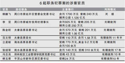 10月26日上午,省高院首次集中通報(bào)了近期宣判的6起在全省有重大影響的職務(wù)犯罪案。涉案的8個(gè)被告人中,有3個(gè)縣委書記,一個(gè)縣長,兩個(gè)區(qū)委書記,一個(gè)信用社理事長,一個(gè)高校黨委書記。涉案金額最高的上億元,最少的24萬元。其中3個(gè)人被判處無期徒刑和死緩。
