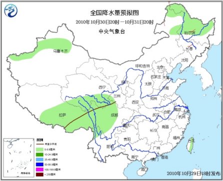 10月31日20時(shí)至11月1日20時(shí),新疆南疆西北部、青海東南部、西藏中東部、川西高原等地的部分地區(qū)有小雨(雪)或雨夾雪;甘肅南部、寧夏南部、陜西中南部、山西西南部、四川大部、重慶西部、云南北部、海南東部以及臺(tái)灣大部有小雨或陣雨。內(nèi)蒙古中東部、東北、華北北部等地有4~6級(jí)風(fēng)。渤海、黃海北部有5~7級(jí)偏北風(fēng);臺(tái)灣海峽、南海中北部有6~8級(jí)東北風(fēng)。