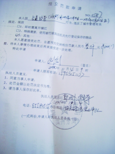記者現(xiàn)場調(diào)查采訪時,發(fā)現(xiàn)大多攤主的手中,除了攤位費收款收據(jù)外,還有一張由“鎮(zhèn)江市城市管理行政執(zhí)法局潤州分局”印制的“預(yù)交罰款申請”單復(fù)印件,申請人是組織者劉某。內(nèi)容是“本人因占道經(jīng)營行為,違反了城市管理有關(guān)規(guī)定,本人愿意接受處罰,自愿預(yù)先繳納相應(yīng)罰款人民幣叁仟元整,待本人事情辦理結(jié)束后再來接受進一步處理”。