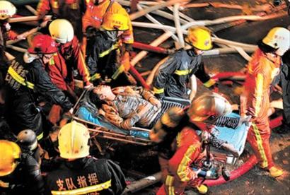 由于火災撲救時間較長,一些消防救援人員也已經體力不支。記者看到,一名消防人員險些昏倒在現(xiàn)場,旁邊的120救援人員和民警立即趕上,扯開他的衣服,并立即對他展開急救。另一名消防人員由于不堪大火高溫的炙烤,他的頭盔里裹著一條濕毛巾,而他依然背著一名已經昏迷的被困市民踉踉蹌蹌地跑出火災現(xiàn)場。旁邊的同事見狀立即上前扶住被困市民,這名消防人員隨即跌坐在了積水的地面上。