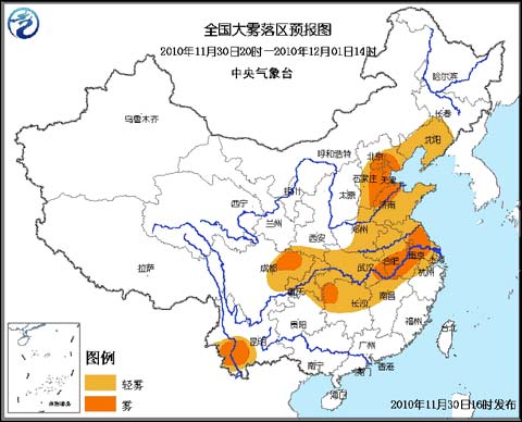中央氣象臺11月30日18時發(fā)布大霧藍(lán)色預(yù)警: