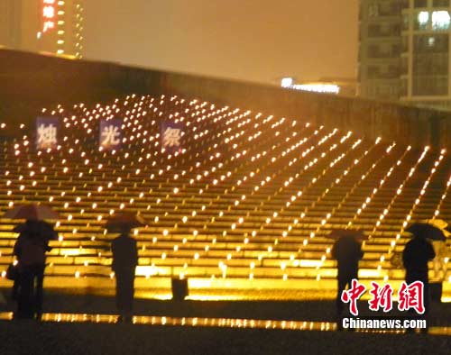 在天飄細雨的冷夜,燭光在集會廣場百層臺階上搖曳。來自俄羅斯、泰國、日本等國際友好人士,以及北京、沈陽、福建等地場館的官員,與藝術團的孩子們一起在象征“和平之舟”的船頭上,點亮了代表悼念30萬遇難同胞的3000支紅燭,點點燭光也代表了人們對世界和平的熱愛、珍視和期盼。該館講解員張亮朗讀了由朱成山館長撰寫的《把和平的燭光點亮、點亮、點亮》的詩歌。